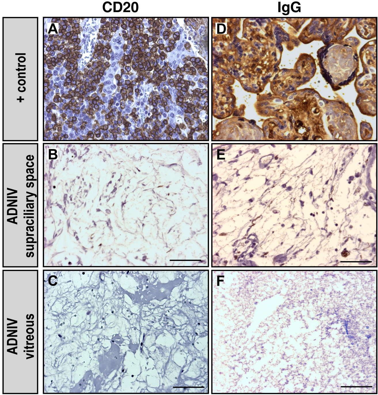 the brown color reaction. B-C: ADNIV supraciliary space and vitreous showed only rare CD20 positive cells. D: Placental tissue is a positive control for immunoglobulin-G (IgG), which was shown by the brown color reaction. E-F: IgG was rarely detected in ADNIV eyes. The scale bar represents 50 µm.