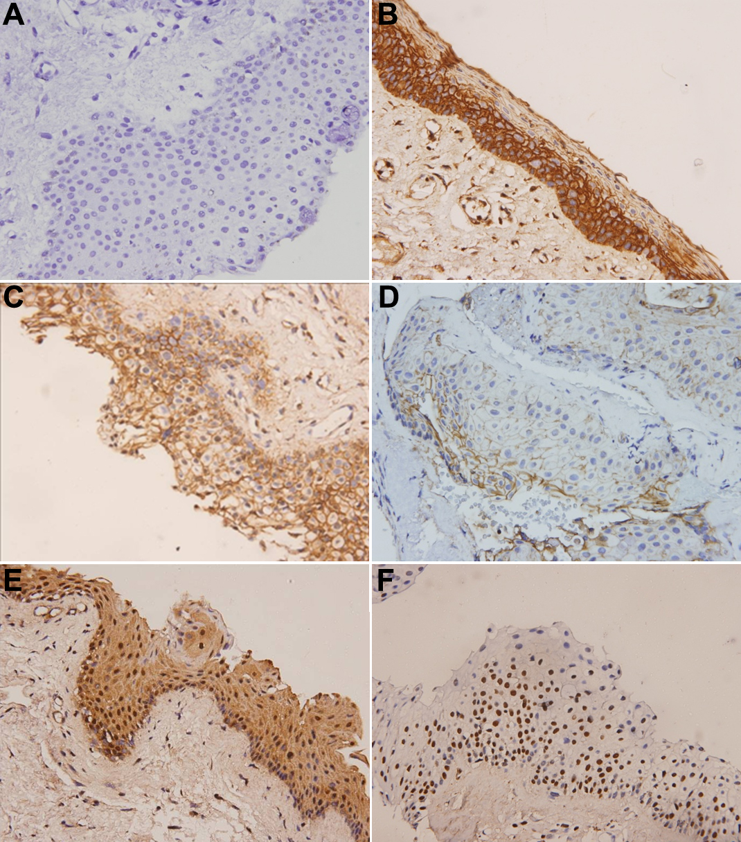 in the cytoplasm/nuclei (E) and nucleus (F) (400×).