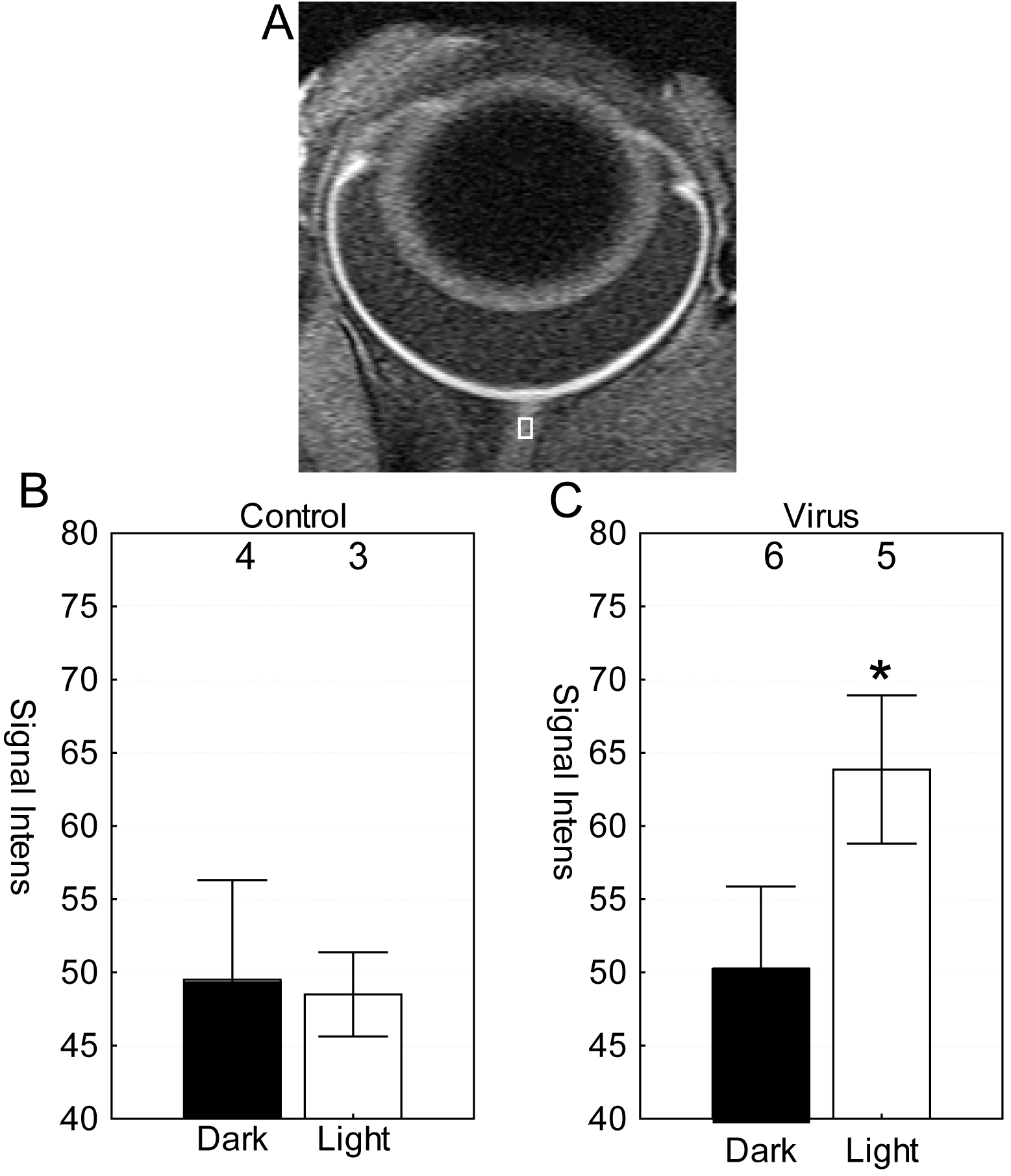 and dark conditions. A: Region-of-interest on optic nerve of