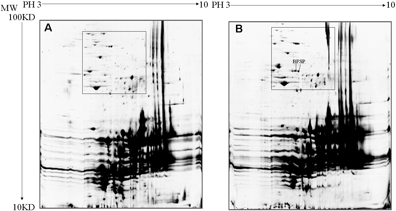 were shown in the rectangle box. A: Cataract mice. BFSP/filensin spots were absent. B: Normal mice. BFSP/filensin spots were highly detectable in normal samples.