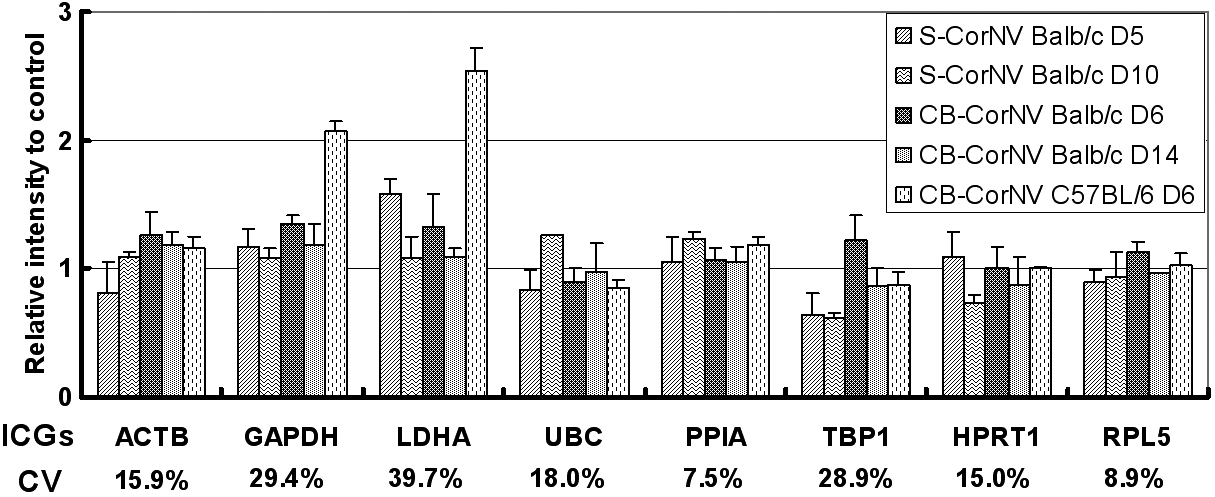 Figure 2. Changes in expression of the 8 HKGs in murine corneas with experimental CorNV as assessed by microarray. The ratios were obtained