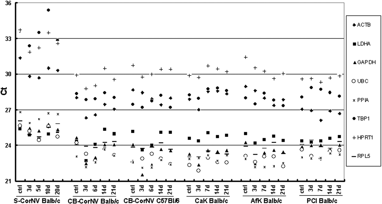 data for 8 candidate HKGs in each corneal disease model obtained using qRT–PCR. It should be noted that each point represents the mean of reactions performed in triplicate for each cDNA sample and for each gene.