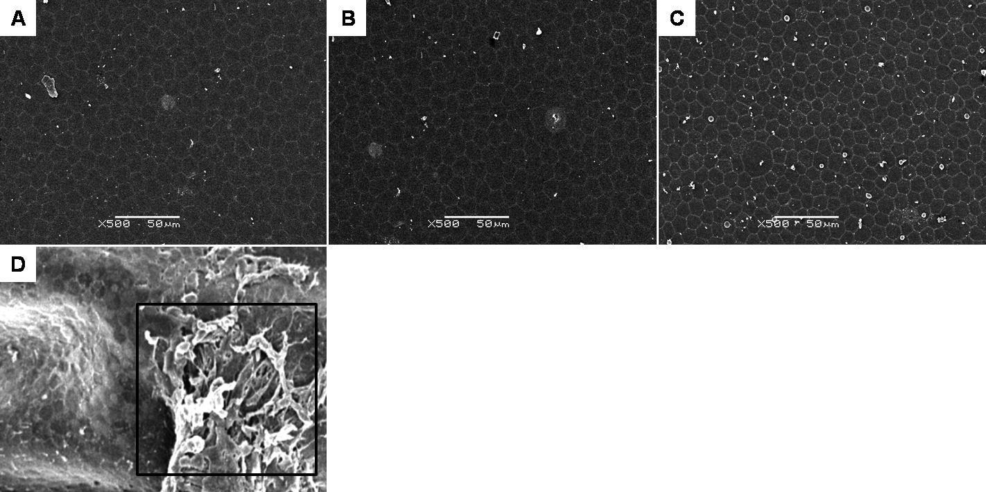 Figure 6. Scanning electron micrographs of rabbit corneal endothelium from the three different groups (A-D). All endothelial surfaces showed a regular hexagonal cellular mosaic and well-defined cell borders, with occasional pleomorphic