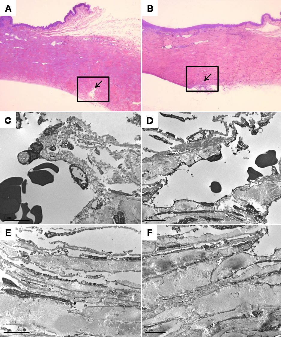 Figure 8. Light microscopy (A, B) and transmission microscopy (C-F) of the rabbits’ trabecular meshwork. Light micrographs of all groups showed the intact geometry of the meshwork. The trabecular