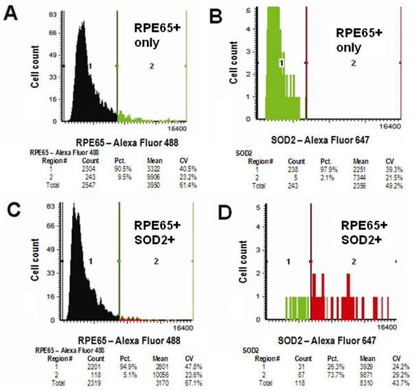 antigoat IgG secondary antibody). Abbreviations: RPE65+ represents cells expressing RPE65 protein, MnSOD+ represents cells expressing Mn-superoxide dismutase, MnSOD+/RPE65+ represents cells expressing both Mn-superoxide dismutase and RPE65 protein, C57BL/6J represents C57BL/6J strain of mice.