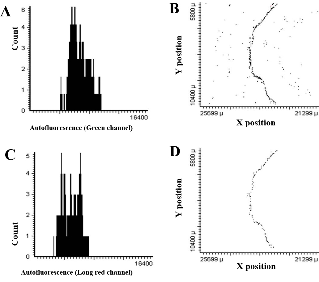 up to the primary antibody step. The background fluorescence in each channel was then analyzed. Panel A shows autofluorescence in the green channel. Panel B shows an X–Y position plot of the same data. Most autofluorescent cells fall in a line consistent with the location of the retinal pigment