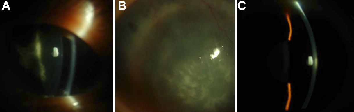presents corneal pannus (B); the normal subject (III-26) shows a