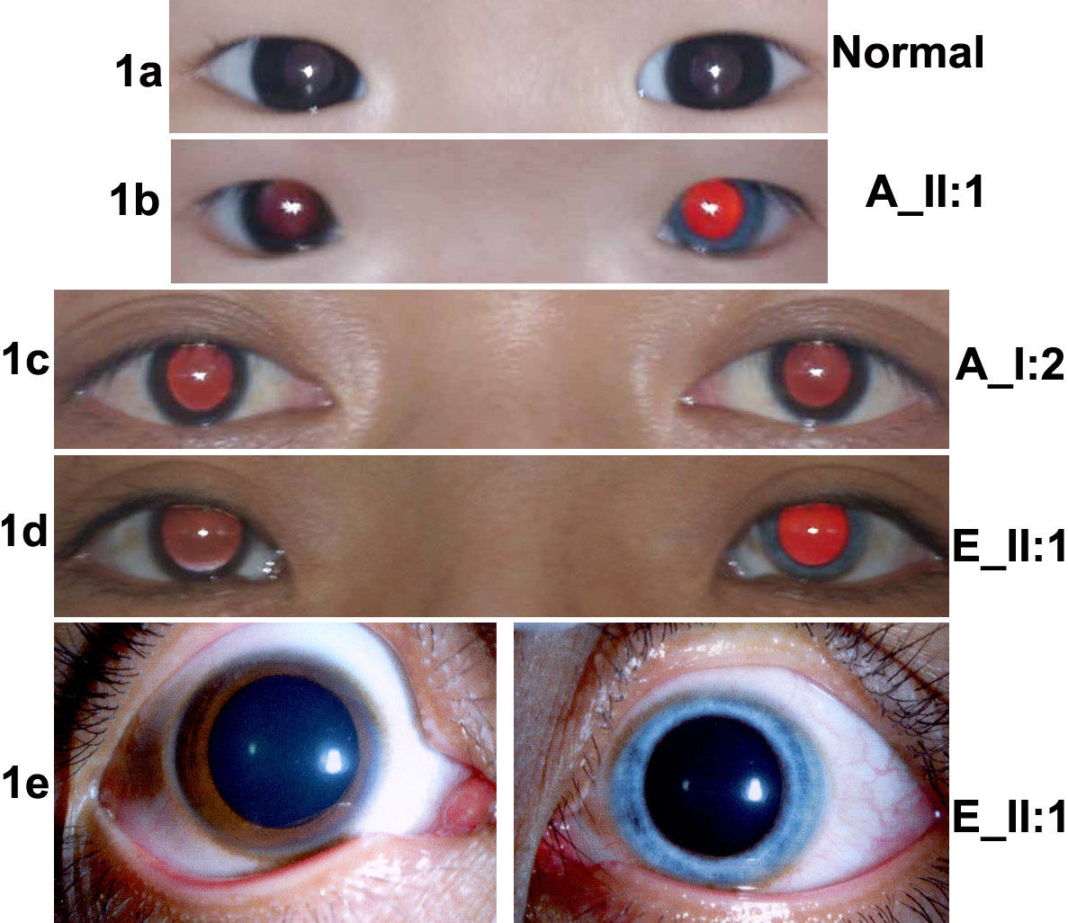 E: Adult II:1 from family E showed dystopia canthorum, heterochromia iridis (left iris).