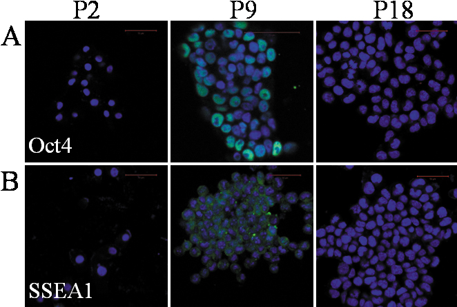 Expression of pluripotency-associated proteins Oct-4 and SSEA1 in e-Pc with immunofluorescent staining. The scale bar represents 50 μm. Oct-4 and SSEA1 proteins were found in P9 (week 4), not in P18 (week 8) cells.
