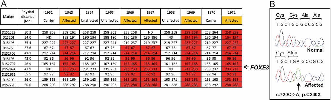 2009 assembly (hg19) of the UCSC Genome Browser. The FOXE3 gene is marked within the refined interval at 47.9Mb. B: The sequencing chromatogram shows the c.720C>A mutation in the FOXE3 gene in an affected member of the Pakistani pedigree.