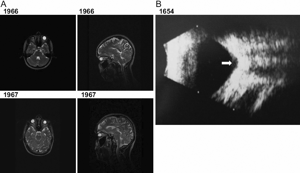 Figure 4. Retrospective analysis of the patients with sclerocornea for further ocular abnormalities. A: Axial and sagittal T2-weighted MRI scans of the head and orbits of two affected members 1966 and 1967 (aged 25 and 22 years