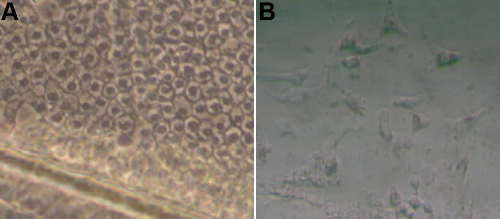 Images of human primary lens epithelial cells. Lens epithelial cells adhering to anterior capsule on the dish (A); 5 days later the human lens epithelial cells migrate from the anterior capsule to the dish (