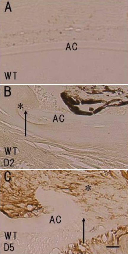 at day 5 post-injury. The arrows indicate the edge of the break in the anterior capsule. Bar, 10 μm.