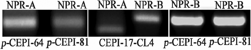 Figure 1. Detection of NPR-A and NPR-B mRNAs in human p-CEPI and CEPI-17-CL4 cells by RT–PCR. Lanes 1 and 2: NPR-A in human p-CEPI cells (donor ages 64 and 81); Lane 3: NPR-A in human CEPI-17-CL4 cells. The PCR product for NPR-A is equal to 179 bp. Lane 4: NPR-B in human CEPI-17-CL4 cells. The PCR product for NPR-B is equal to 237 bp. Lanes 5 and 6: NPR-B in human p-CEPI cells (donor ages 64 and 81).