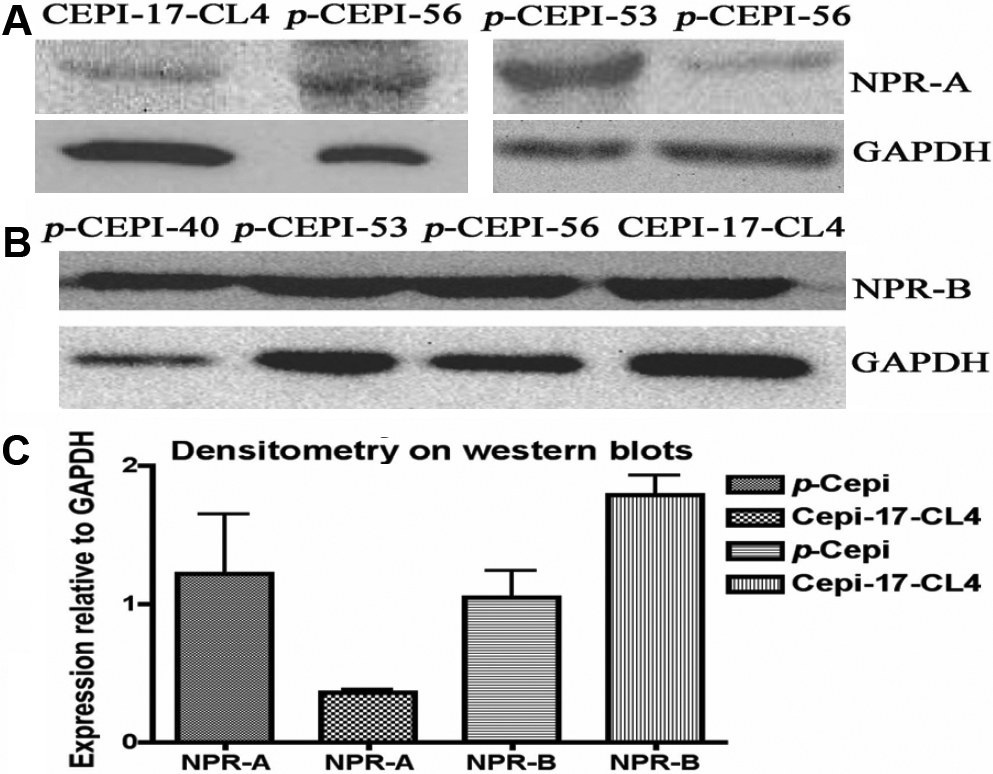 Figure 4. Expression of NPR-A and NPR-B in human p-CEPI cells and CEPI-17-CL4 cells as determined by western blot analysis. A: The presence of NPR-A protein (band observed at 40–55 kDa) in CEPI-17-CL4 and in human p-CEPI cells (from 56, 53, and 56 year old donors) is shown. B: The presence of NPR-B protein (band observed at 24 kDa) is shown for three different donors of human p-CEPI cells (ages 40, 53, and 56) cells and in CEPI-17-CL4 cells. C: The expression of NPR-A and NPR-B in human p-CEPI and CEPI-17-CL4 cells was normalized to GAPDH. The figure shows an apparent lower expression of NPR-A in CEPI-17-CL4