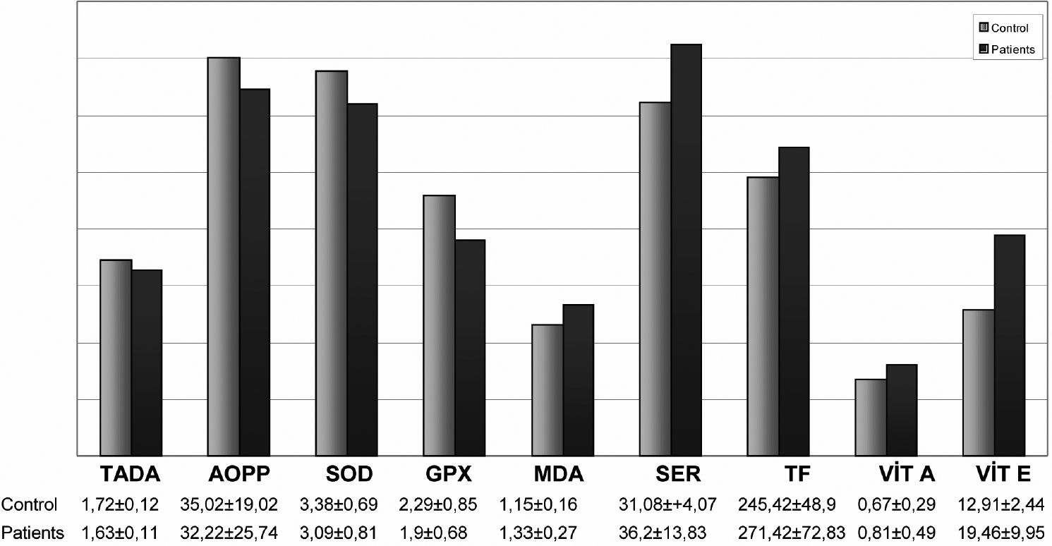 Comparison of the oxidative stress results between control and patient groups.