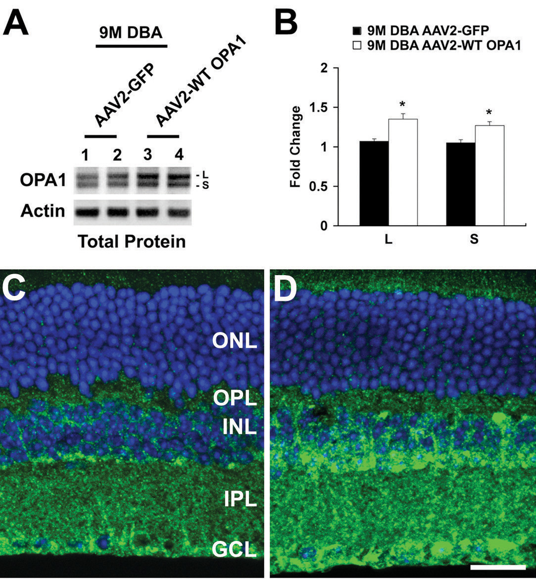 Null. C: OPA1 immunoreactivity in glaucomatous DBA/2J mice transfected with AAV2 Null. D: OPA1 immunoreactivity in glaucomatous DBA/2J mice transfected with AAV2-CMV-WT mOPA1. Abbreviations: ONL represents outer