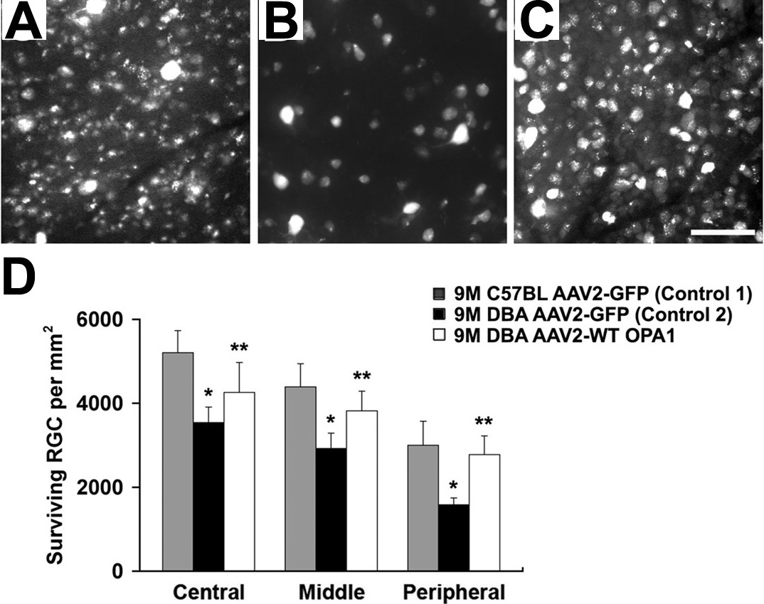 labeling with FluoroGold. A: Non-glaucomatous C57BL/6 mice transfected with AAV2-CMV-GFP; n=4 retinal flatmounts/mice/group. B: Glaucomatous DBA/2J mice transfected with AAV2-CMV-GFP; n=4 retinal flatmounts/mice/group. C: Glaucomatous DBA/2J mice transfected with AAV2-WT mOPA1; n=7 retinal flatmounts/mice/group. D: The quantitative analysis of RGC survival. Data represent the mean±SD *Significant at p<0.05 compared with non-glaucomatous