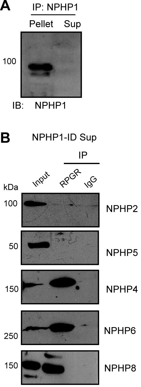 subsequently used for IP experiments. B: NPHP1-immunodepleted supernatant (NPHP1-ID sup) was subjected to IP with anti-RPGR antibody followed by immunoblot analysis.