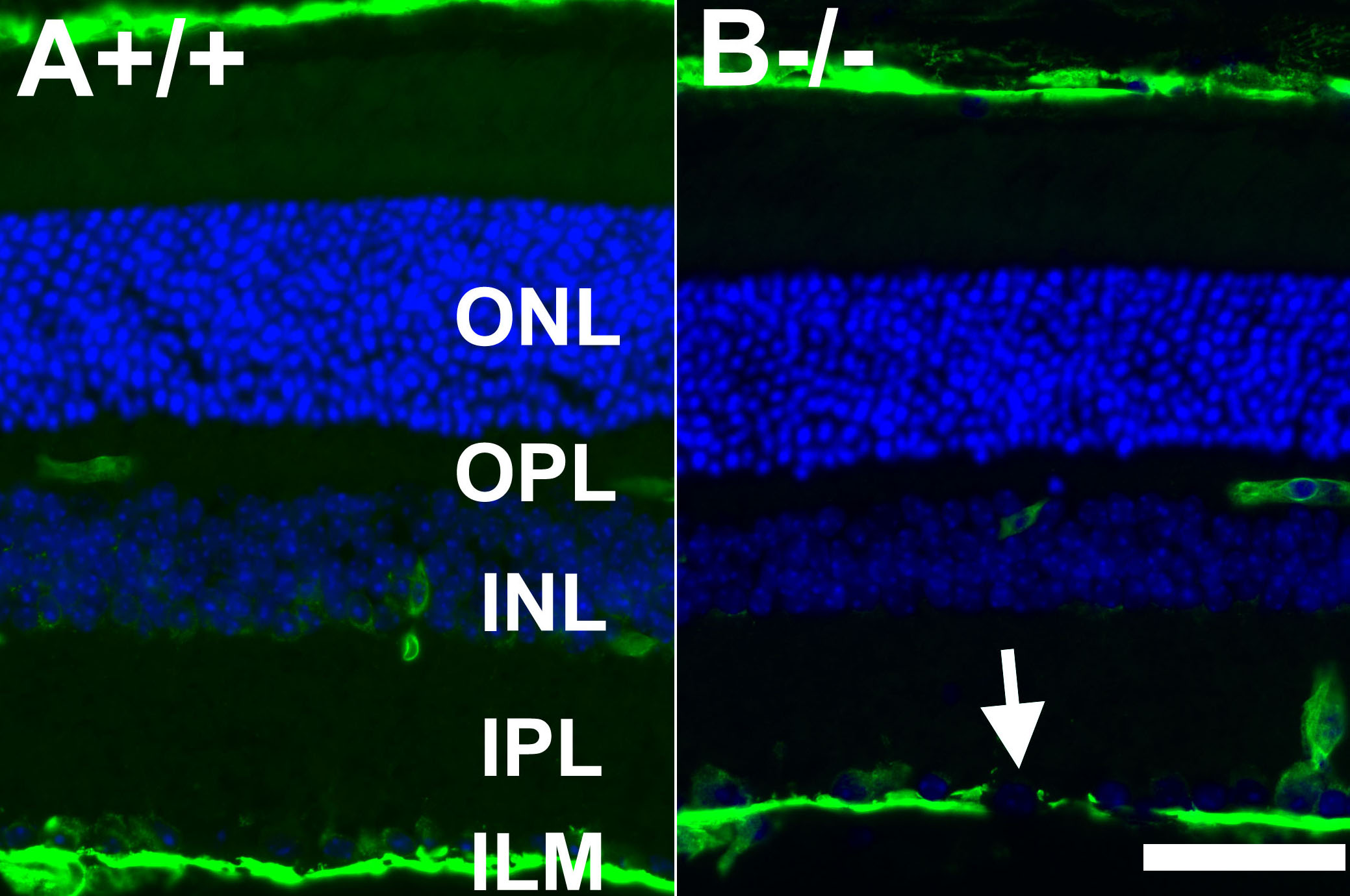 (−/−) mouse retina. The scale bar in B is equal to 50 μm.