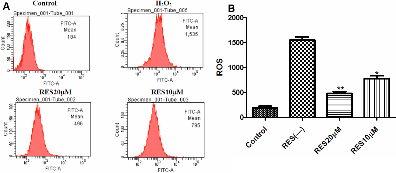 Figure 2. Resveratrol reduced the generation of ROS. A: The cells were pretreated with 10.0 and 20.0 μΜ RES for 12 h followed by treatment with 100 μM H2O2 for 2 h. The production of ROS was examined by measuring the level of ROS production using DCF-DA by flow cytometry. The