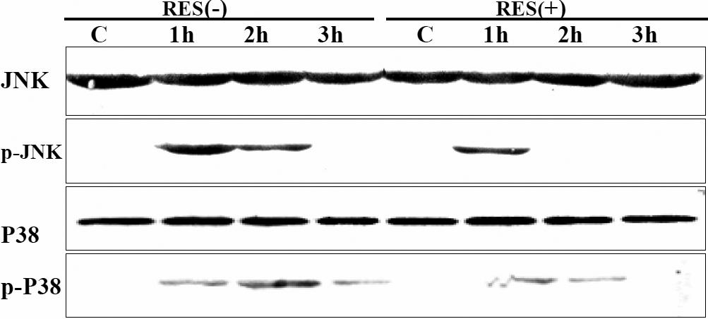 western blotting analysis using anti-phosphorylated p38 and anti-phosphorylated JNK antibodies. Resveratrol significantly