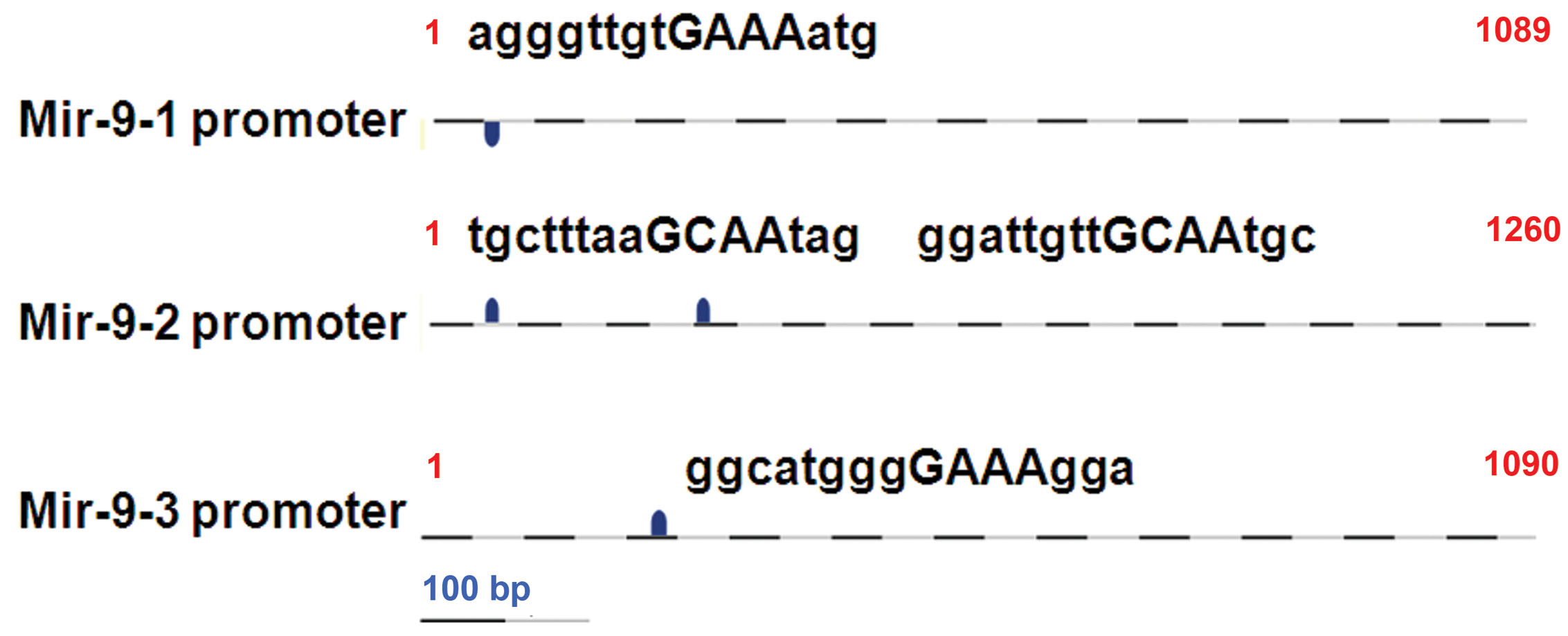 kb) upstream of the miR-9 genes were analyzed for the presence of