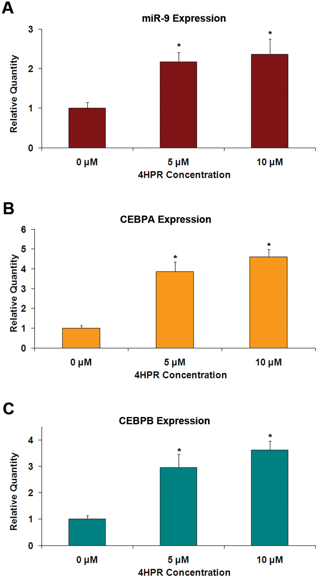 4HPR increased miR-9 expression. B: 4HPR increased CEBPA