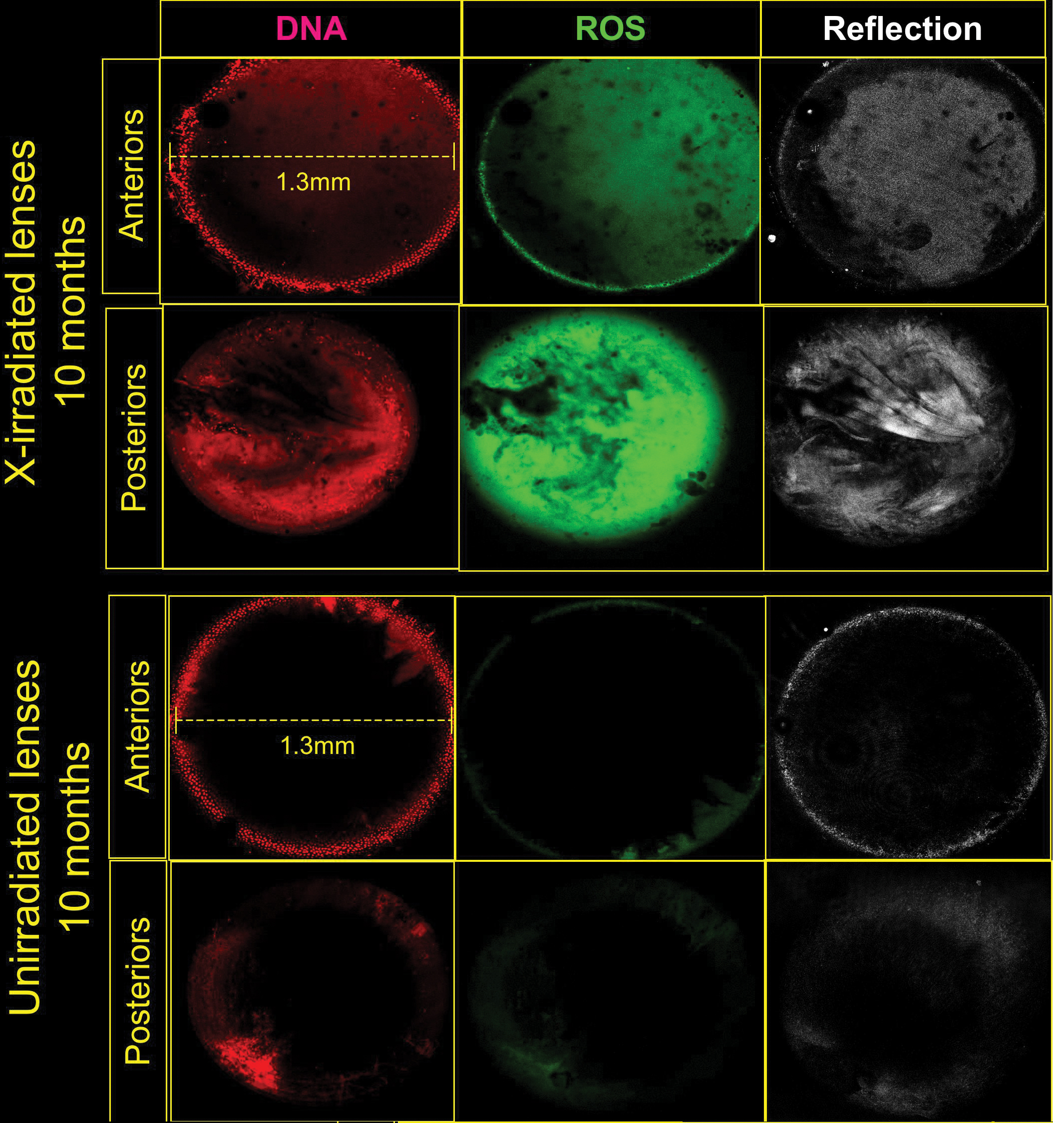 ROS (oxidized DHR) is shown in green, and cataract reflected light in