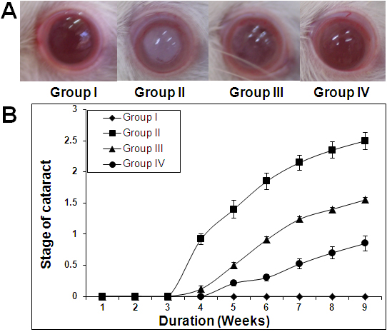 Figure 1. Delay of diabetic cataract in rats by ginger. A: Representative photographs of lens from each group at the end of 9 weeks. B: Quantitative representation of cataract progression in each group with time. Stage of cataract in each group was averaged