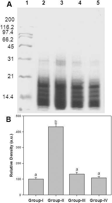 Lane 4 - Group III; Lane 5 - Group IV. B: Densitometric