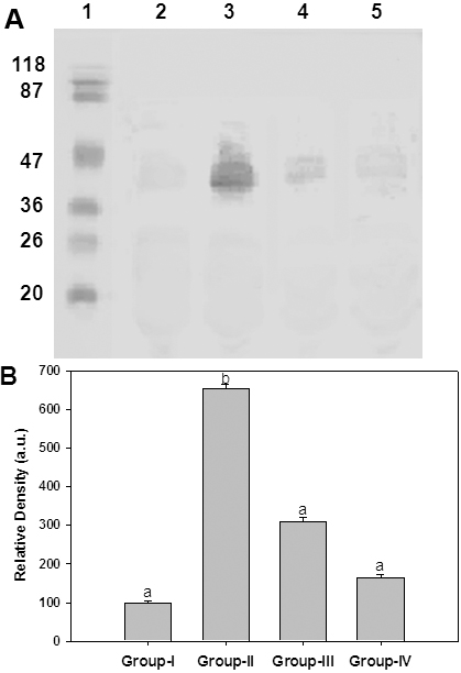 markers, Lane 2: Group I, Lane 3: Group II, Lane 4: Group III, Lane 5: Group IV. B: Densitometry analysis of AGE-BSA. Intensity of AGE-BSA signals was quantified considering the intensity of lane 2 in upper