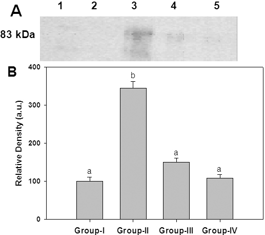 markers, Lane 2: Group I, Lane 3: Group II, Lane 4: Group III, Lane 5: Group IV. B: Densitometry analysis of CML-BSA. Intensity of CML-BSA signals was quantified considering the intensity of lane 2 in upper