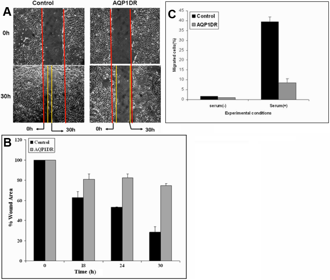 Figure 3. Effect of siRNA mediated AQP1 down-regulation (AQP1DR) on cell migration in HCEC cells. Panels A and B show that AQP1DR decreased cell migration as determined by the scratch wound healing assay in control and AQP1DR cells.