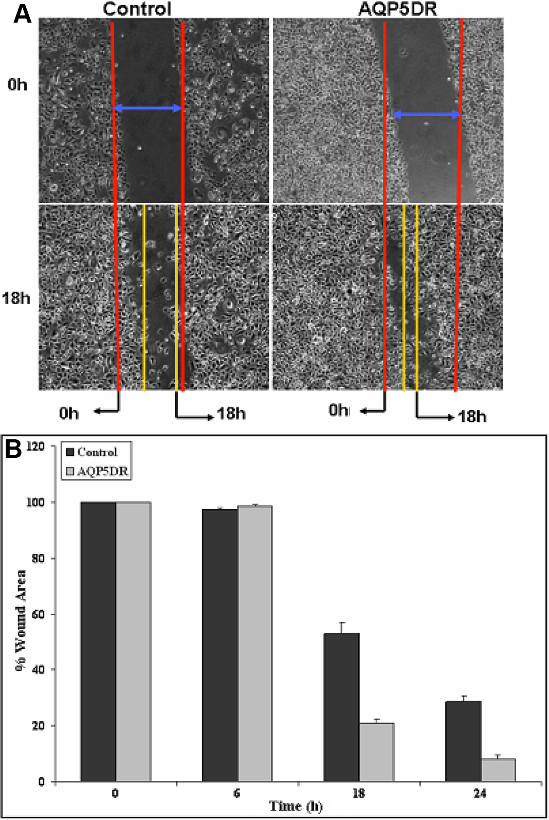 Figure 5. Effect of siRNA mediated AQP5 down-regulation (AQP5DR) on cell migration in CEPI17 cells. Panels A and B show that AQP5DR decreased cell migration as determined by the scratch wound healing assay in control and AQP5DR cells. The