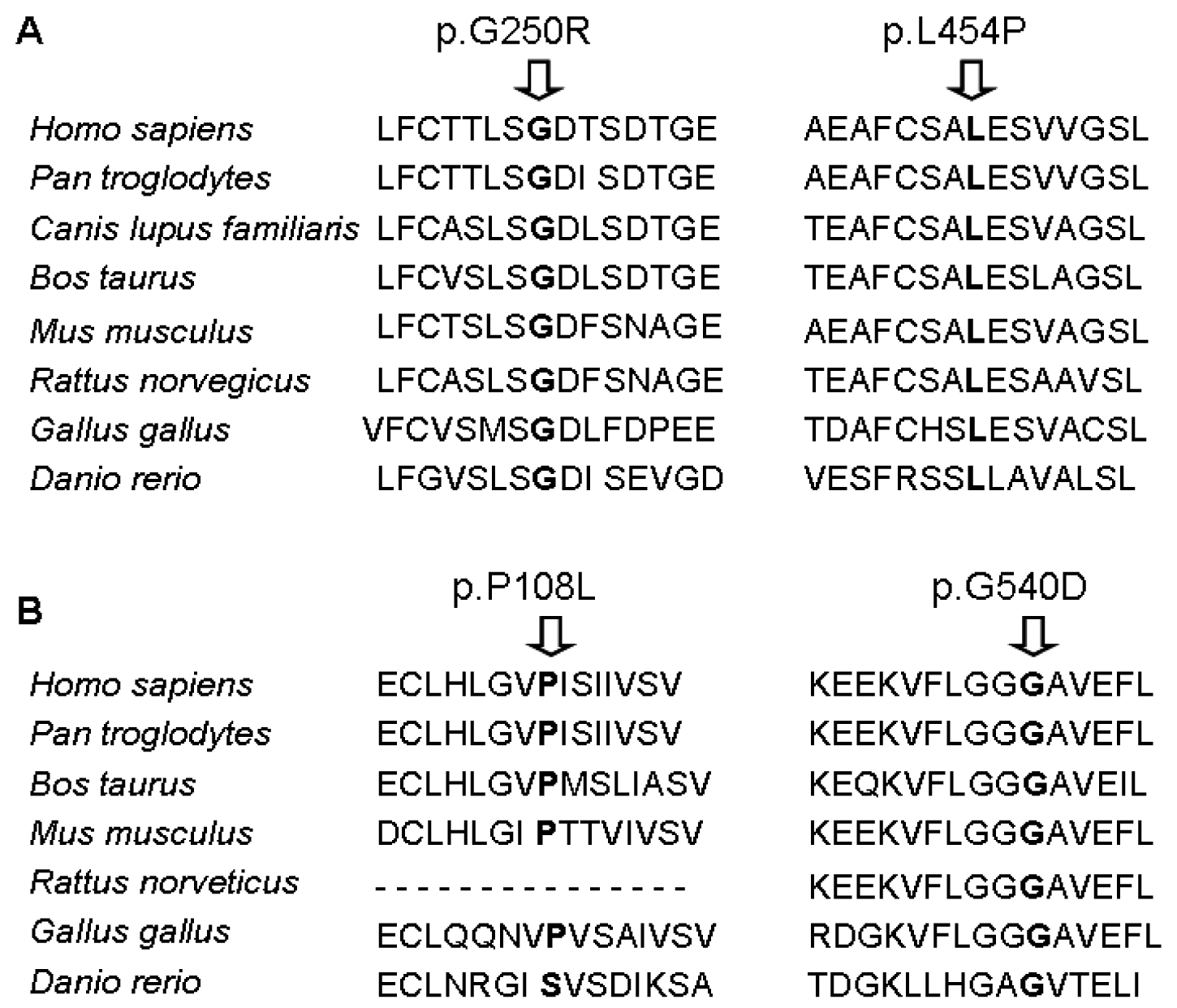 Sequence alignment of BBS6 protein and BBS12 protein of several species, showing the conservation of the amino acid implicated in the missense mutations.