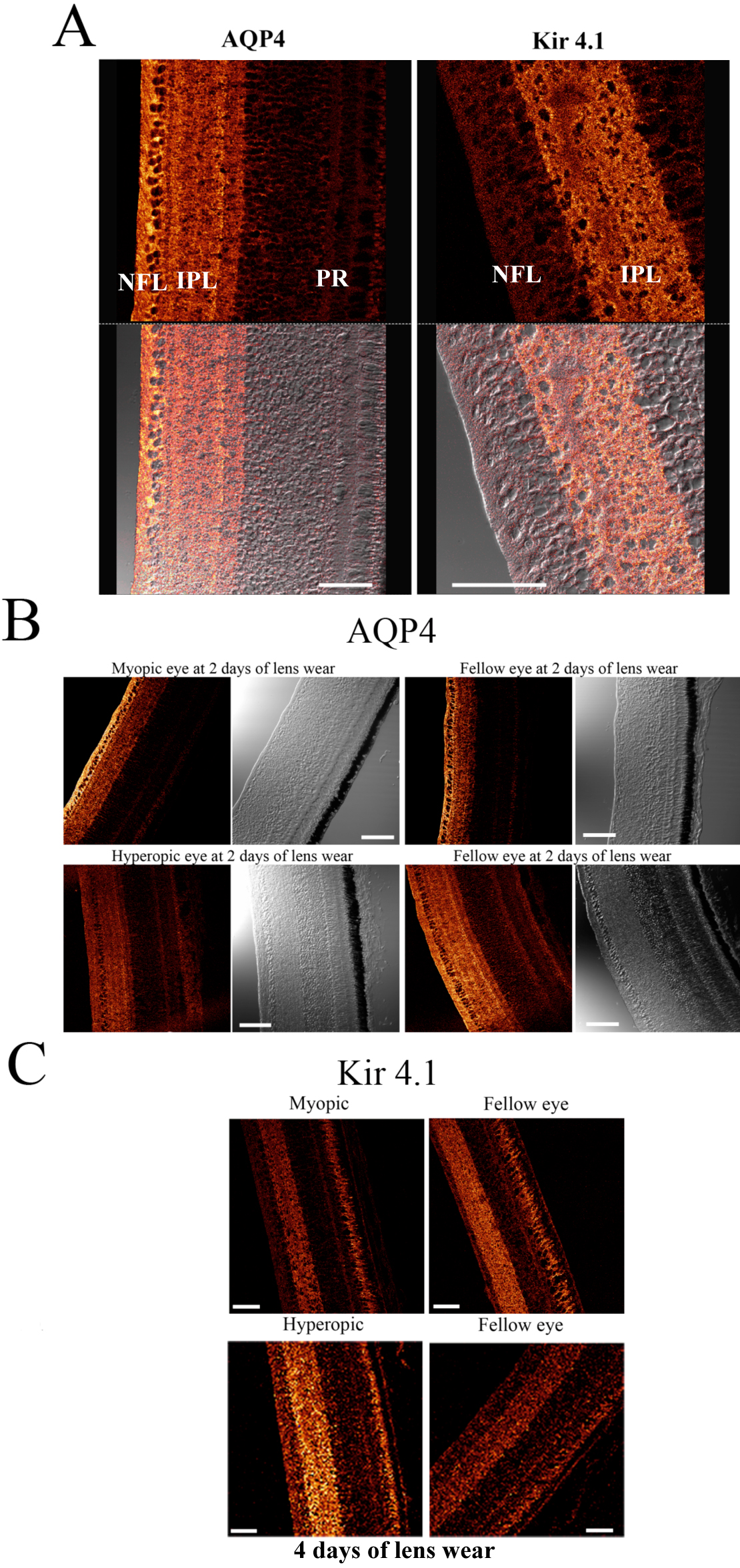50 µm. C: Kir4.1 immunoreactivity after 4 days of lens wear. Upper panels show Kir4.1 immunopositivity in the myopic and fellow eye.