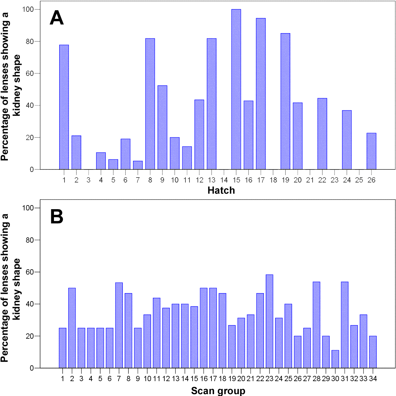 proportion of kidney-shaped lenses as a function of scan group (i.e.,
