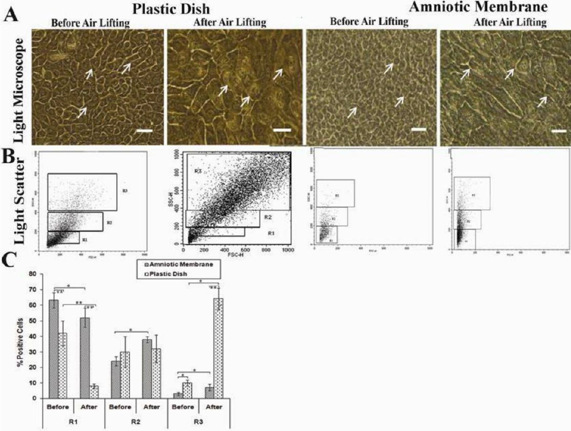 µm. B: Assessment of cell heterogeneity in R1: 10–200 or limbal stem cell (LSC), R2: 200–400 or Transient amplifying cells (TAC),