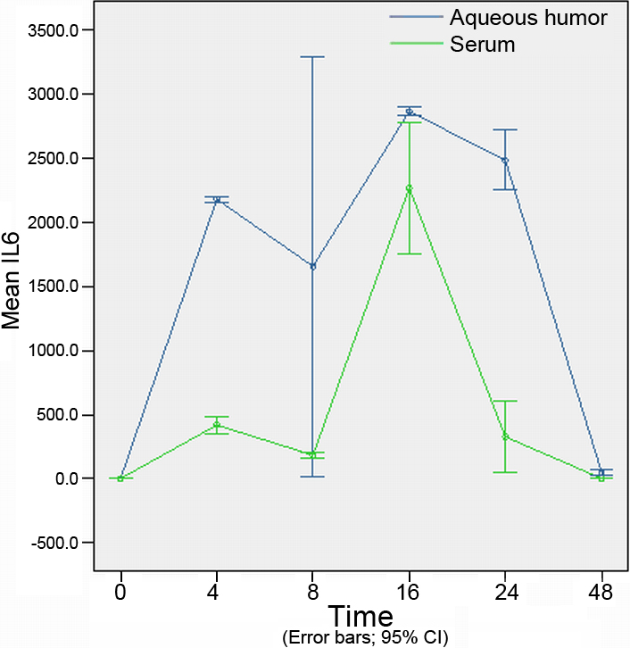 Figure 5. The expression of interleukin-6 in the aqueous humor and serum at different time points (expressed as the mean μg/l±SD). The