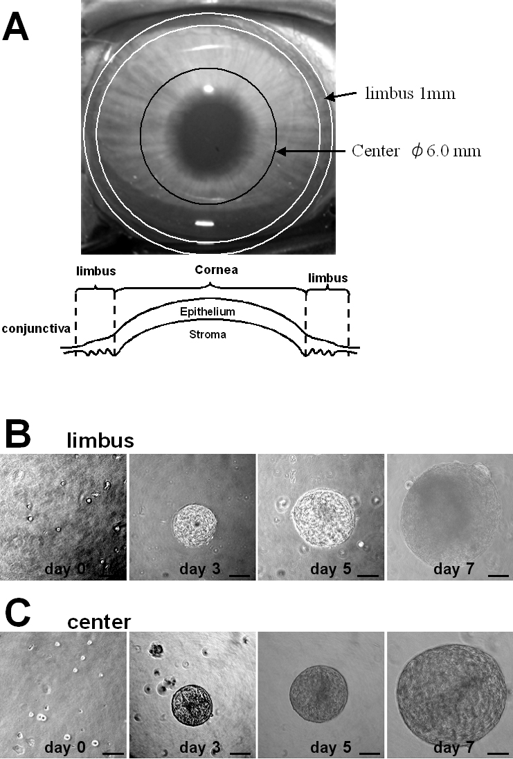 Figure 1. Sphere-forming culture of rabbit corneal epithelium. A: Anterior view of a rabbit cornea and a diagram of the corneal epithelium. B, C: Rabbit corneal epithelial cells from the limbus or central cornea formed spheres. Growth of a representative single sphere