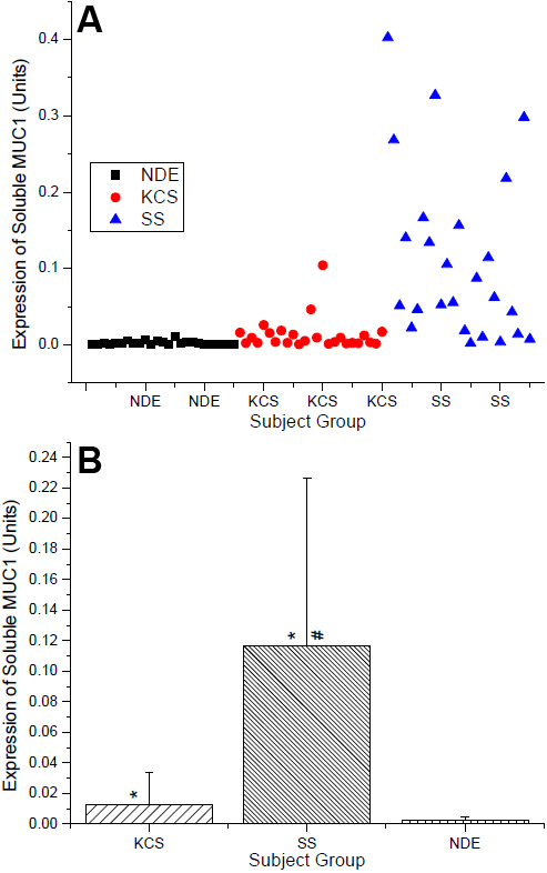 Figure 2. Soluble MUC1 expression as quantified by western blotting. Data expressed as (A) scatter graph of individual data points and (B) mean data. Protein samples collected via eye wash and MUC1 data expressed in Units/μg protein as calculated from interpolation