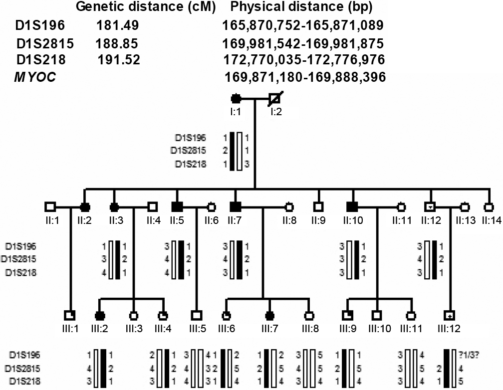 Figure 1. Family structure and haplotype analysis of a Chinese family with JOAG. Pedigree and haplotype analysis of the family with