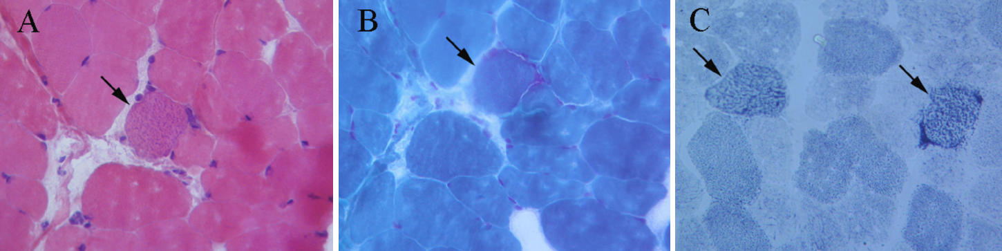 : SDH staining shows ragged-blue fibers (arrows). Magnification 400×.