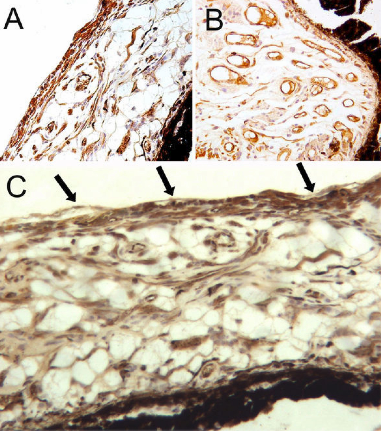 Figure 6. Immunohistochemistry of VIII factor for number counting of new vessels of iris. The density of iridis new vessels in the monkey