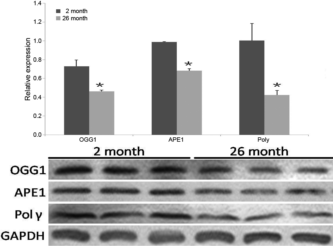 Figure 5. Protein levels of BER enzymes are decreased in aged rat lens. There were significant decreased in OGG1, APE1, and Polγ protein