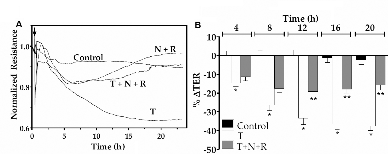 TNF-α-induced reduction in TER after 12 h of exposure. * and ** denote