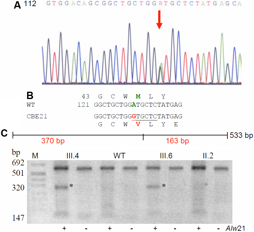 a new Alw21I restriction site (underlined) in two (III.4 and III.6) of the affected members of the family checked, while the