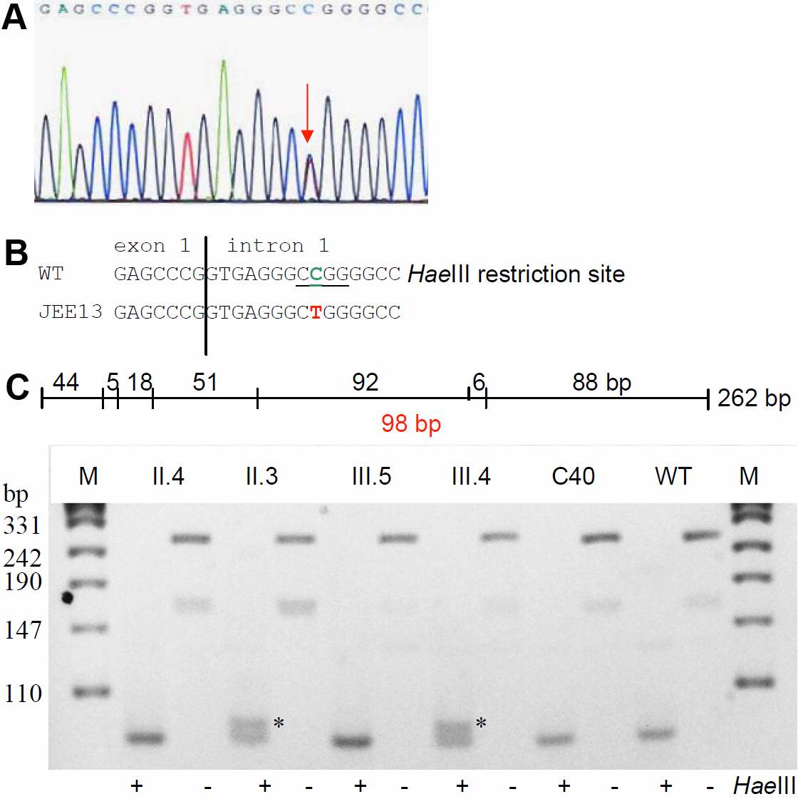 (III.4). The asterisks mark the additional band of 98 bp indicating the mutation; the band of 262 bp indicates the undigested