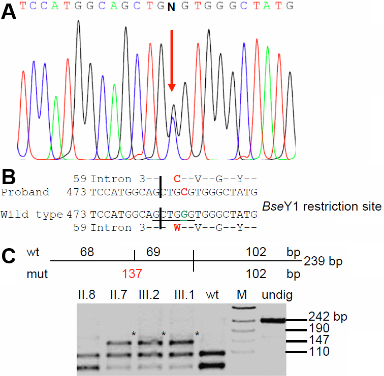 mark the additional band of 137 bp indicating the mutation; “undig” is an undigested PCR fragment of 239 bp. WT represents